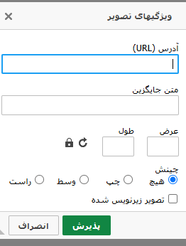 که آدرس تصویر در قسمت (آدرس (URL) می گذاریم وسط یا چپ و راست رو انتخاب می کنیم طول و عرض رو عرض رو مثلا 350 استاندارد می دهیم حالا اگر بیشتر خواستید بدید ولی از کادر پست بیرون نزنه بعد پذیرش رو می زنیم و تصویر در داخل پست می ره
