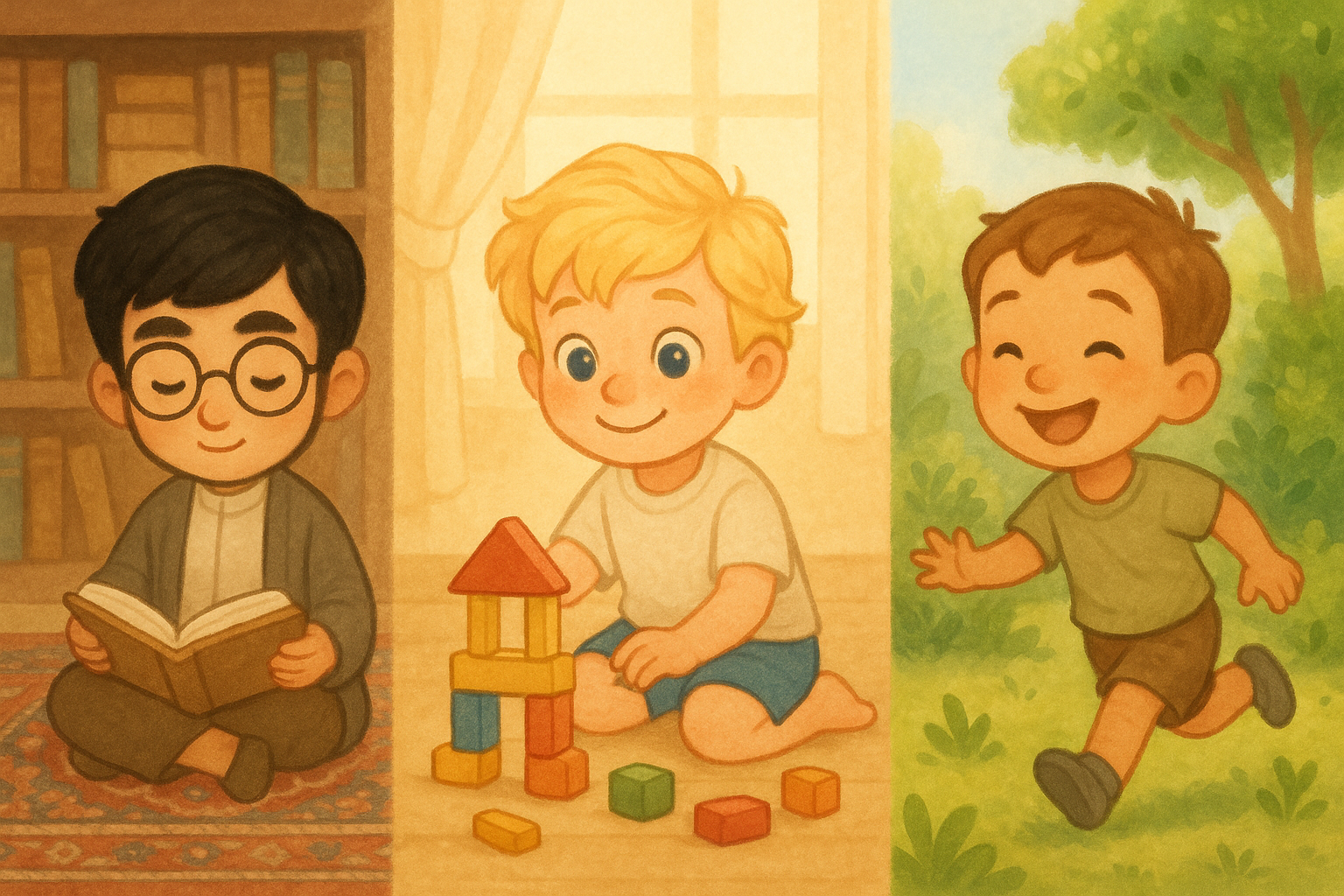 تصویر ۱: سه کودک در حال بازی در سه محیط متفاوت (یکی در کتابخانه، یکی در حال ساخت وساز، یکی در حال شیطنت). هر کودک با ویژگی های کارتونی مربوط به شخصیتش.