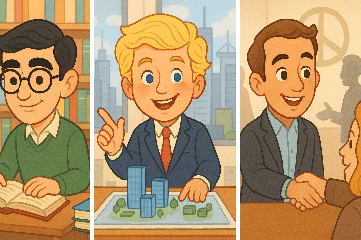 تصویر ۴: سه کودک بزرگسال شده اند. علی در یک محیط آموزشی یا کتابخانه، دان در حال طراحی یک شهر یا ساختمان، بنی در حال کمک به مردم یا در یک جلسه صلح. هر کدام درلباس و با ظاهری مناسب با سن بزرگسالی شان، اما همچنان با نشانه های کارتونی قابل تشخیص.
