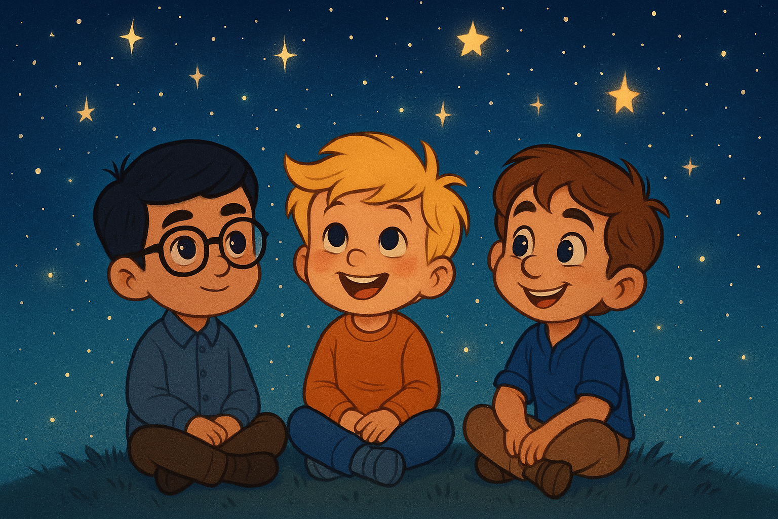یک شب، هر سه دوست زیر ستارگان درخشان با هم نشستند. آسمان پر بود از نقطه های نورانی که چشمک می زدند، گویی به حرفهای شان گوش می دادند. آنها درباره آینده دنیا صحبت کردند، درباره چیزهایی که دوست داشتند ببینند و درباره آرزوهایی که در دل داشتند.